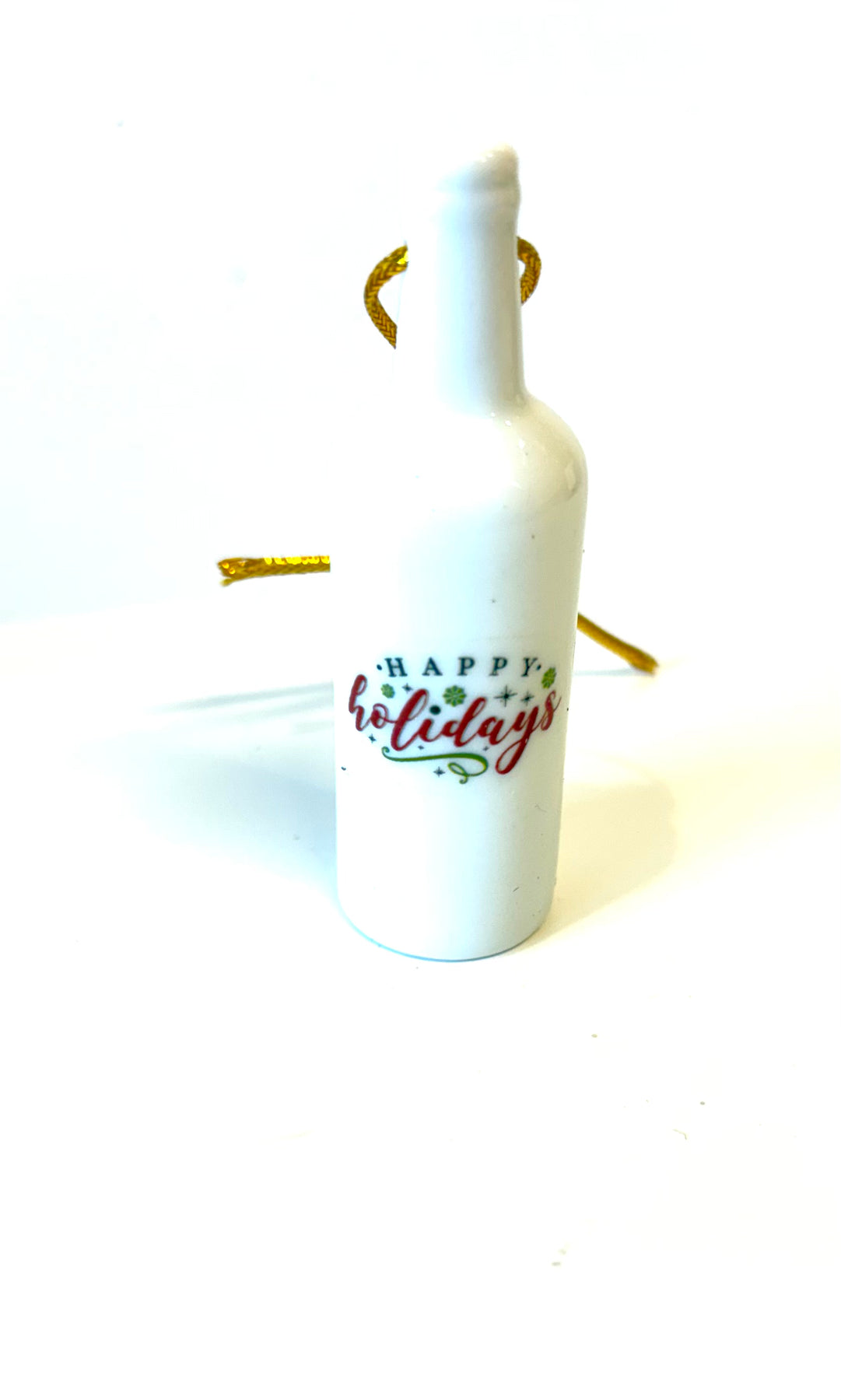This 3.25" white porcelain wine bottle ornament is hand-painted with the words Happy Holidays, adding a touch of holiday cheer to your décor. Perfect for hanging on your tree, gifting to loved ones, or as a charming seasonal accent, each piece is crafted with care to bring timeless elegance and holiday spirit to any setting.