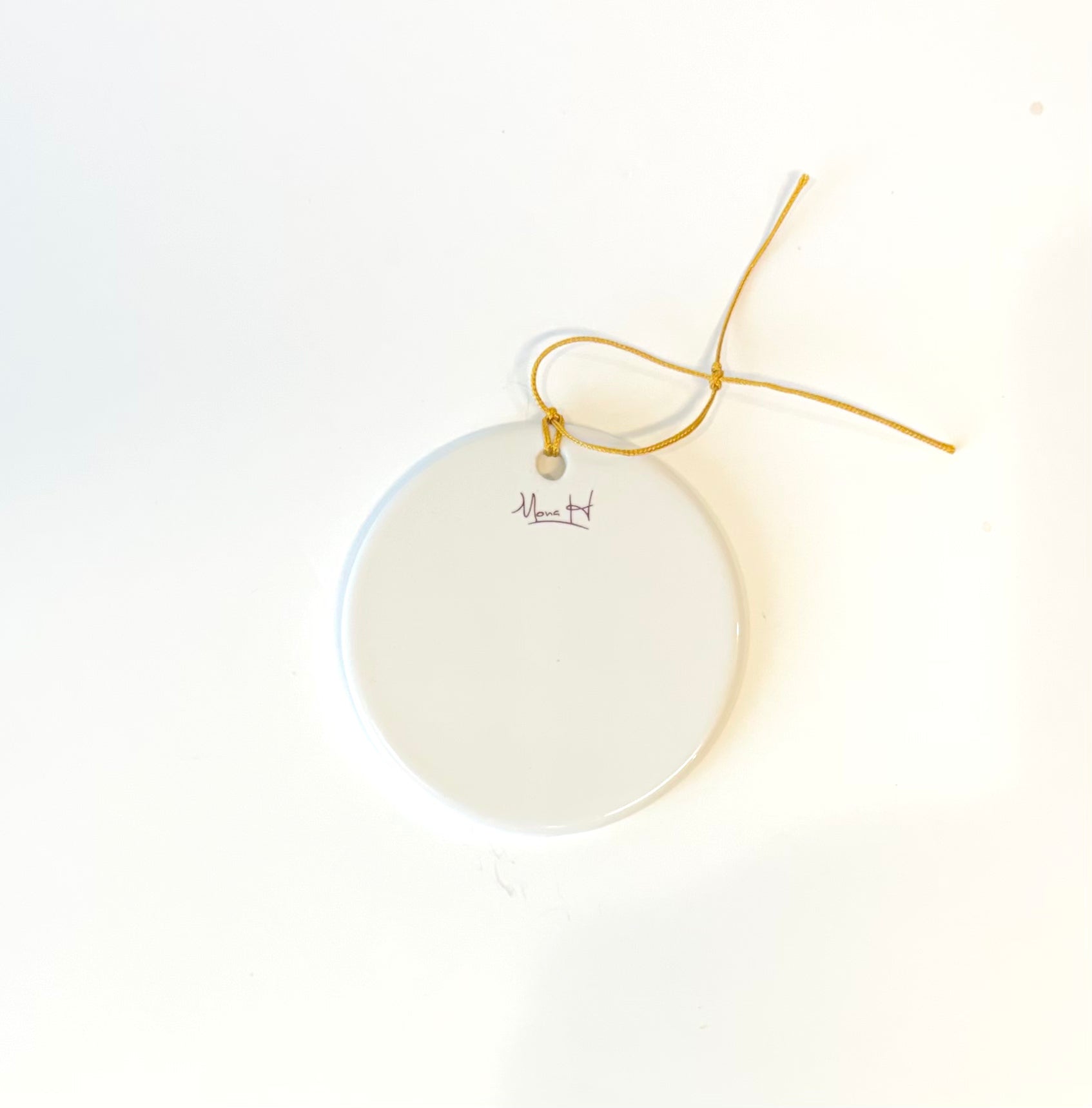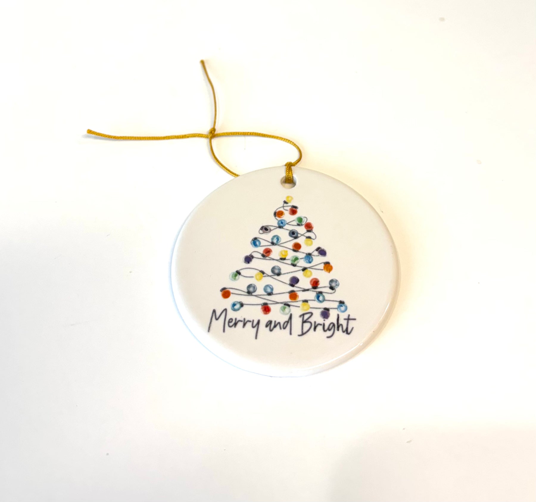 Celebrate the season with this 2.75-inch round white porcelain ornament, hand-painted with a colorful Christmas tree and the festive words “Merry and Bright.” Perfect for holiday trees, seasonal décor, or gifting, this handcrafted piece adds cheerful charm and timeless elegance to any space.
