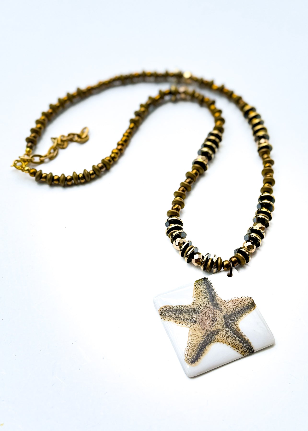 This coastal-inspired necklace features a hand-painted starfish on a smooth white porcelain pendant, strung on a beautifully coordinated beaded necklace. Inspired by the sea, the starfish symbolizes renewal and strength, making this piece both meaningful and stylish. Perfect for beach lovers and coastal décor enthusiasts, this necklace adds a touch of seaside charm and effortless elegance to any outfit.