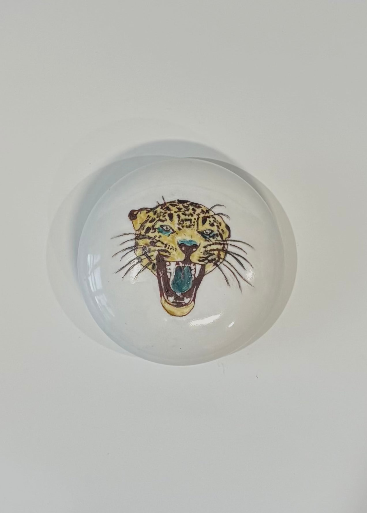 Bring charm and artistry to your desk or display with this 3-inch round porcelain paperweight, hand-painted with a detailed jaguar design. Perfect as a decorative accent or thoughtful gift, this handcrafted piece combines elegance with timeless appeal.