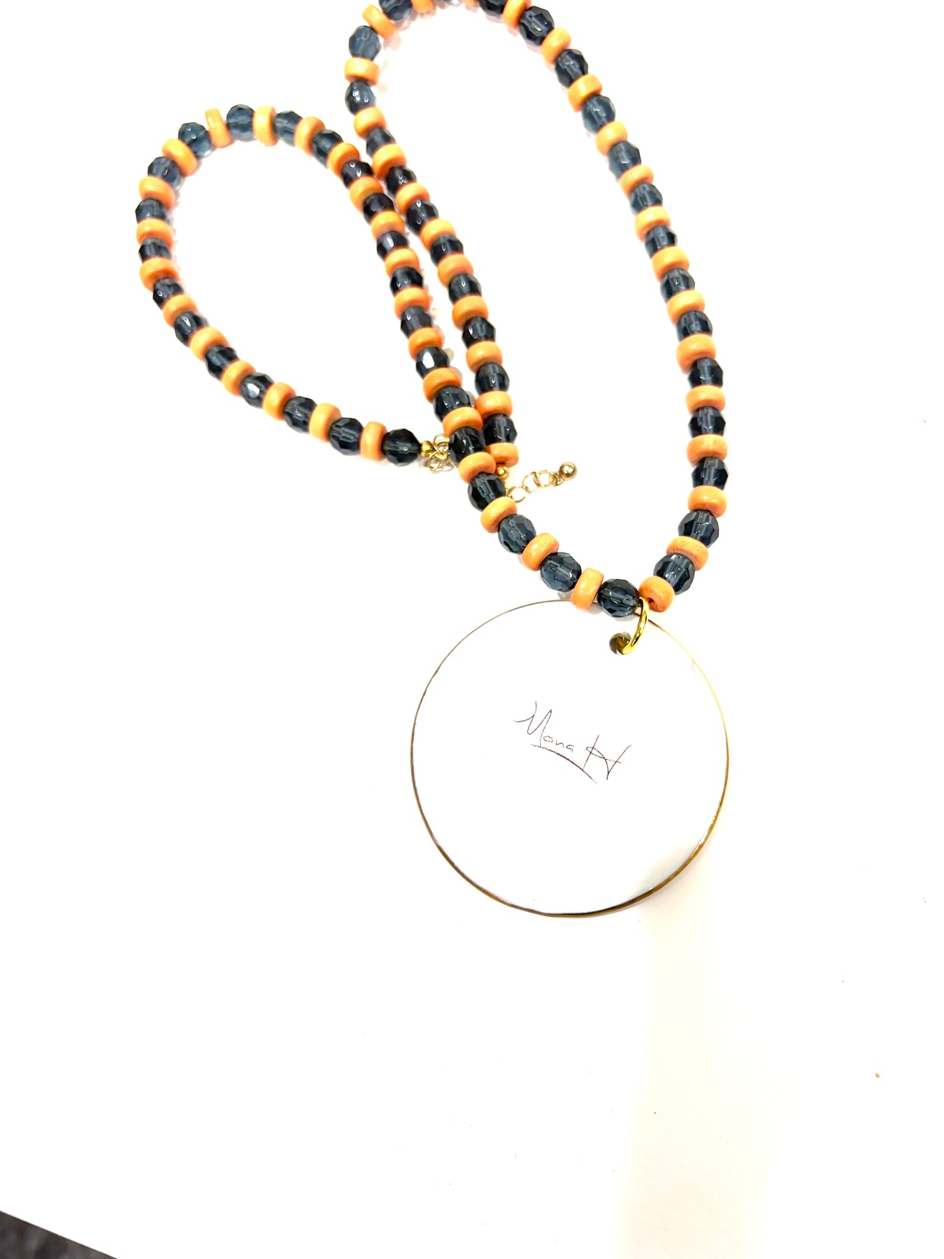 Show your team spirit with this Hand-Painted Eagle Pendant Necklace, featuring a 2.25-inch round porcelain pendant adorned with a detailed eagle design. The pendant is paired with a vibrant orange and blue beaded necklace measuring approximately 12 inches, creating a bold yet artful statement. Carefully handcrafted and fired for lasting beauty, this lightweight necklace blends school pride with timeless, wearable art—perfect for game day or everyday wear.