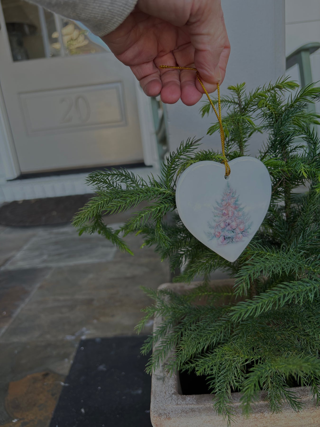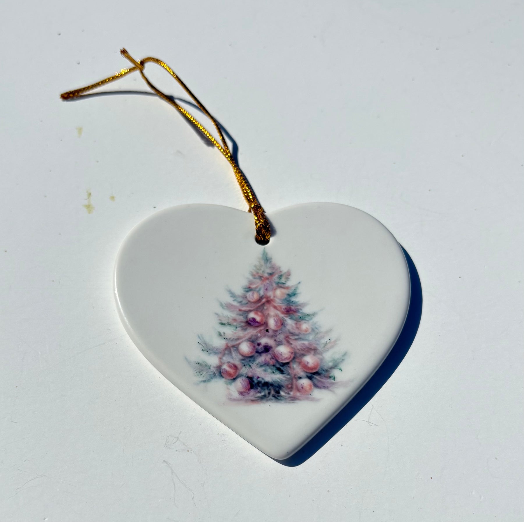 Hand-Painted Christmas Tree on a White Porcelain Heart Ornament