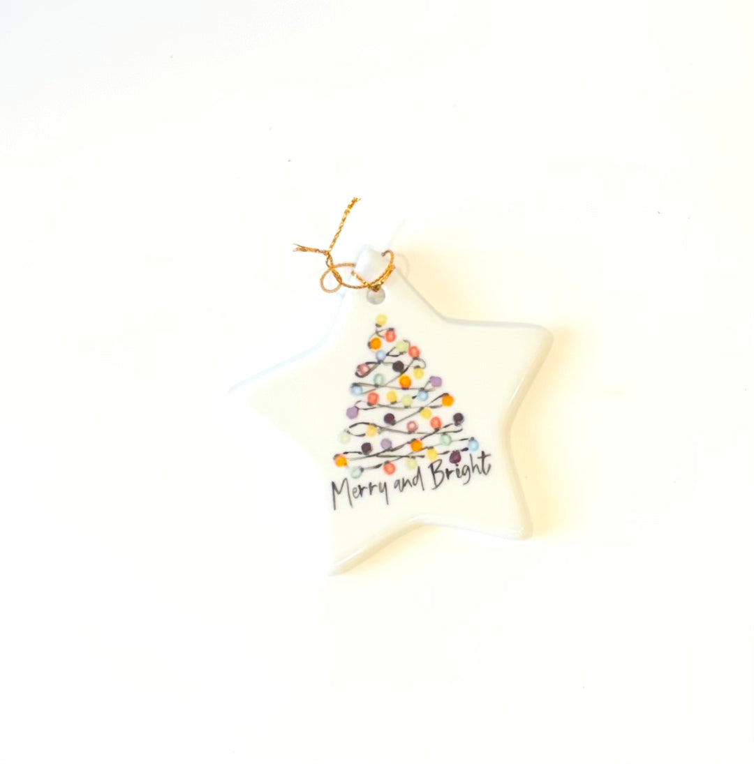 White Porcelain Star Ornament 3.5" with a Hand Painted Christmas Tree