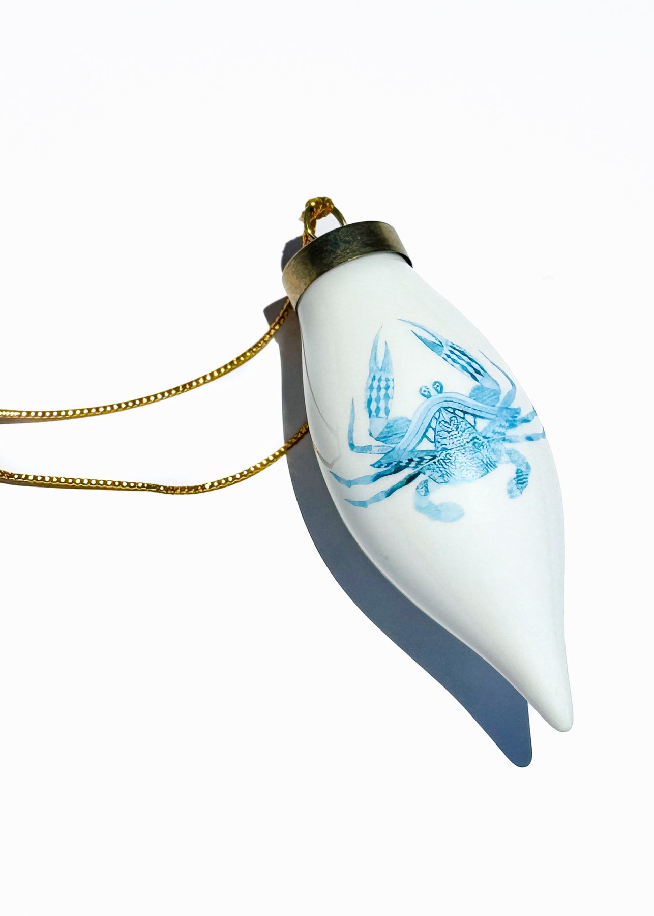 This delicate teardrop ornament features a hand-painted blue crab on a smooth, white porcelain surface. The coastal design adds a touch of beachy charm to any holiday decor. Made with quality materials and intricate details, this ornament is a must-have for any coastal enthusiast.