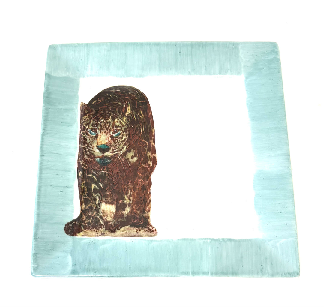 Hand-Painted Jaguar Plate with Teal Rim – 7.25" Square Porcelain