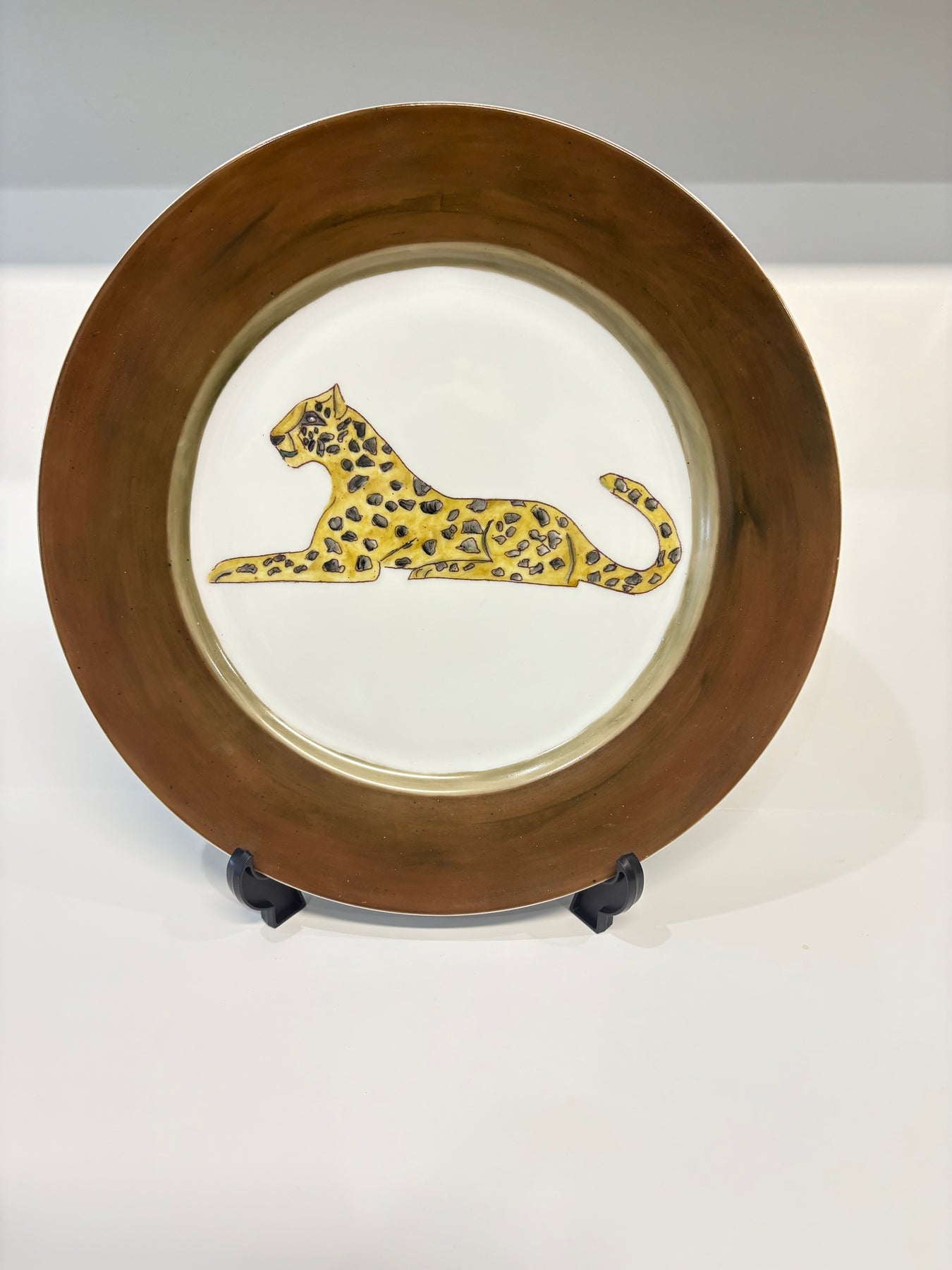 Add bold elegance to your table with this hand-painted porcelain plate featuring a striking jaguar design. Crafted with care and attention to detail, it’s perfect for display or everyday use. A unique piece that brings artistry, personality, and style to any setting. Plate measures 10.75 inches round.