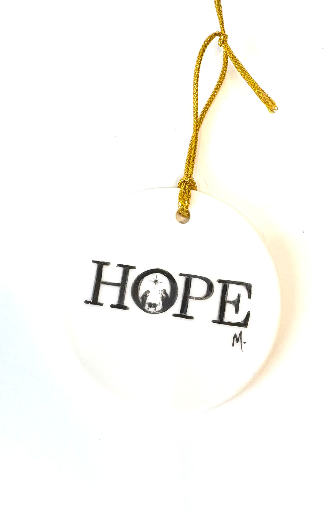 White round 2.75" porcelain ornament with the wording Hope