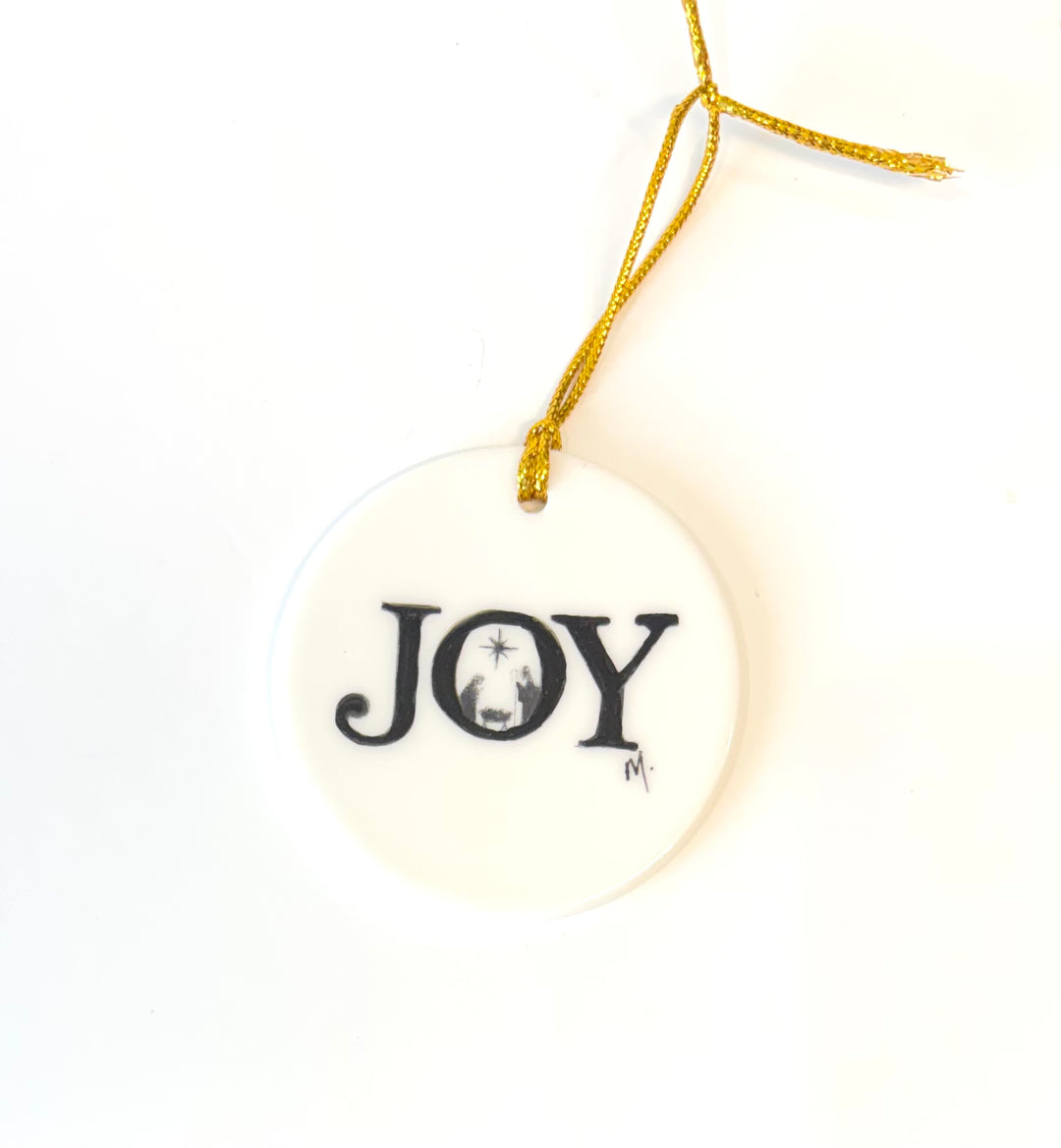 White Round Porcelain Ornament – “JOY” with Manger Scene, 2.75”
