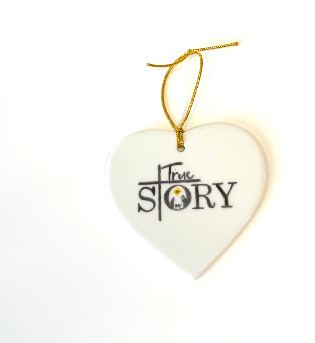 White Heart Porcelain Ornament – “True Story” with Manger Scene, 3.25”