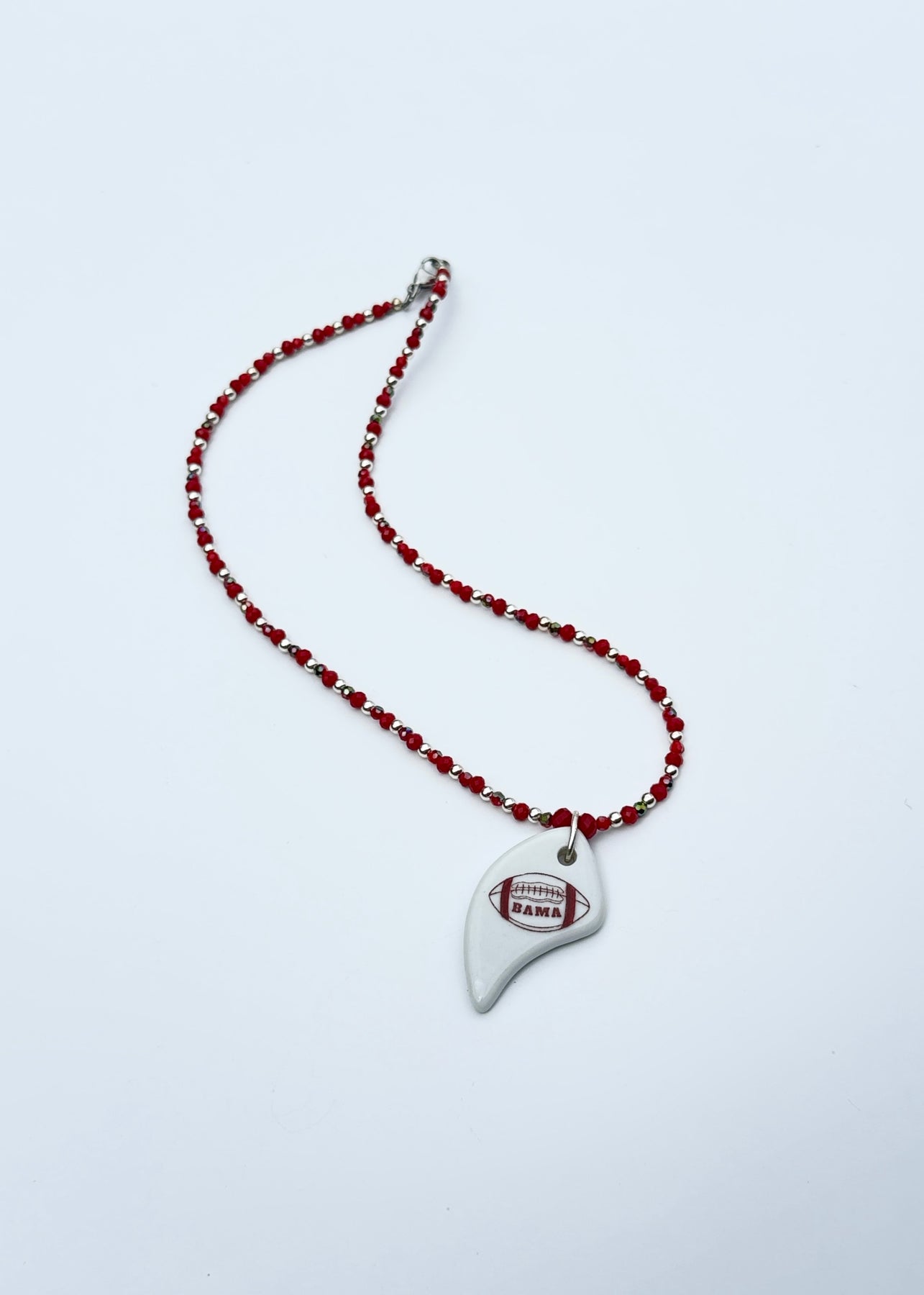The Alabama Game day Necklace is the perfect accessory for any fan. The white pendant on the red and silver beaded chain adds a touch of team spirit to any outfit. Show your support for the Crimson Tide on game day and beyond. Necklace measures approximately 11 inches including the pendant.