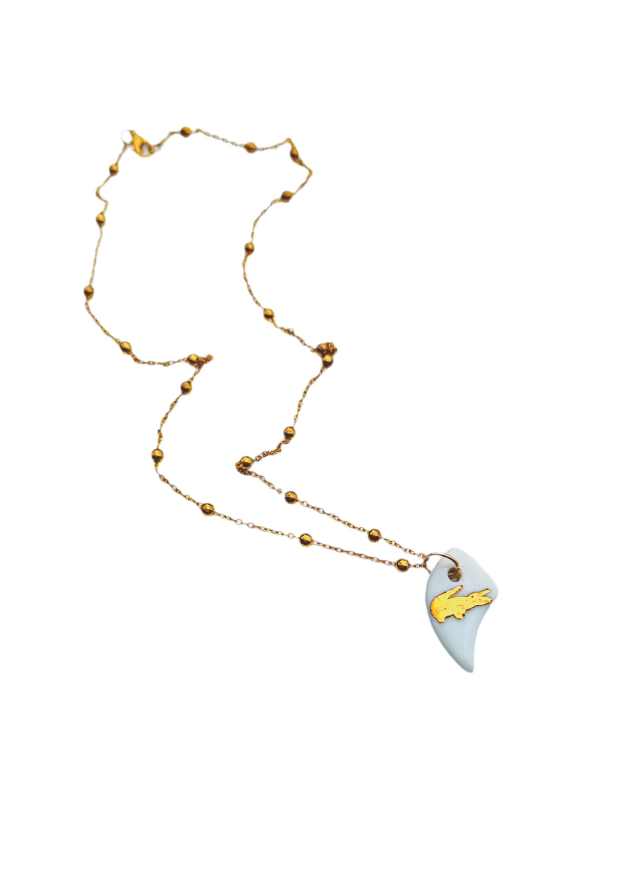 Add a touch of team pride to your game day outfit with the Gator Game day Gold Necklace. This necklace features a metallic gold gator pendant on a gold ball beaded chain, perfect for showing off your support for the FL Gators football team. Made with porcelain and quality materials, this necklace is a must-have for any Gators fan. Necklace measures approximately 13 inches including the pendant.