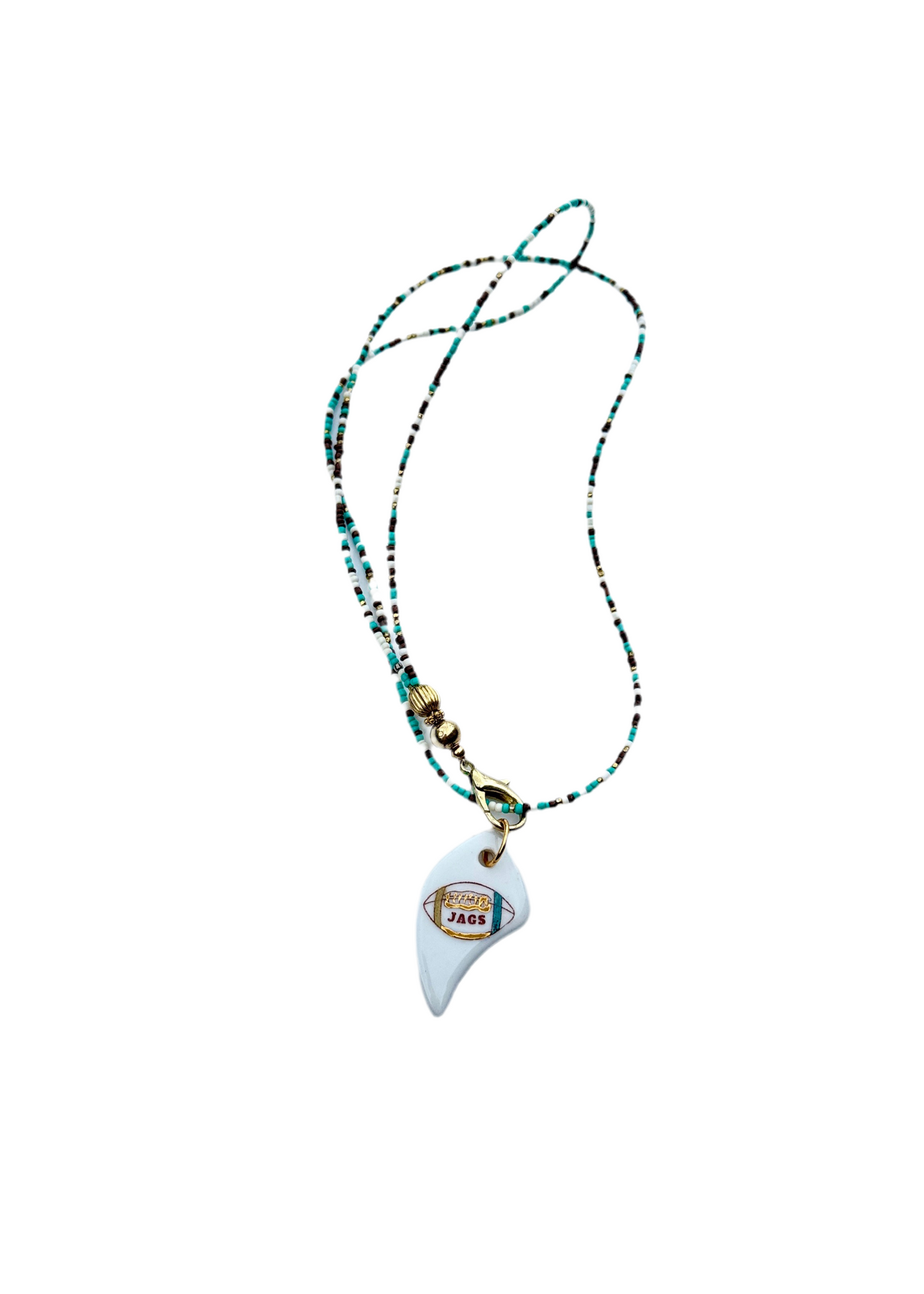 Celebrate game day season with the Jaguar Game day Porcelain Pendant Necklace, featuring a detailed Jacksonville Jaguar design on a porcelain pendant. Suspended from a blue teal beaded chain, this necklace combines team spirit with elegant craftsmanship, making it a perfect accessory to showcase your loyalty while adding a sophisticated touch to your game day outfit. Necklace measures approximately 19 inches long and wrapped for 9.5 inches.
